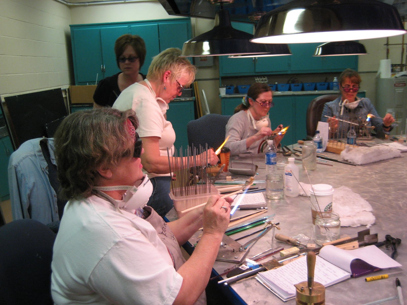 Above are two of the demo beads from the lampworking and electrforming class I taught this weekend at Feugo Loco Studio here in Indianapolis. This was my first time to teach outside of my in home studio. I have done many one on one classes, but this was my first large class. Thanks to everyone who attended, to Jari for the invitation and Samma for assisting me! I hope you all enjoyed and learned a lot! You sure made wonderful beads!!